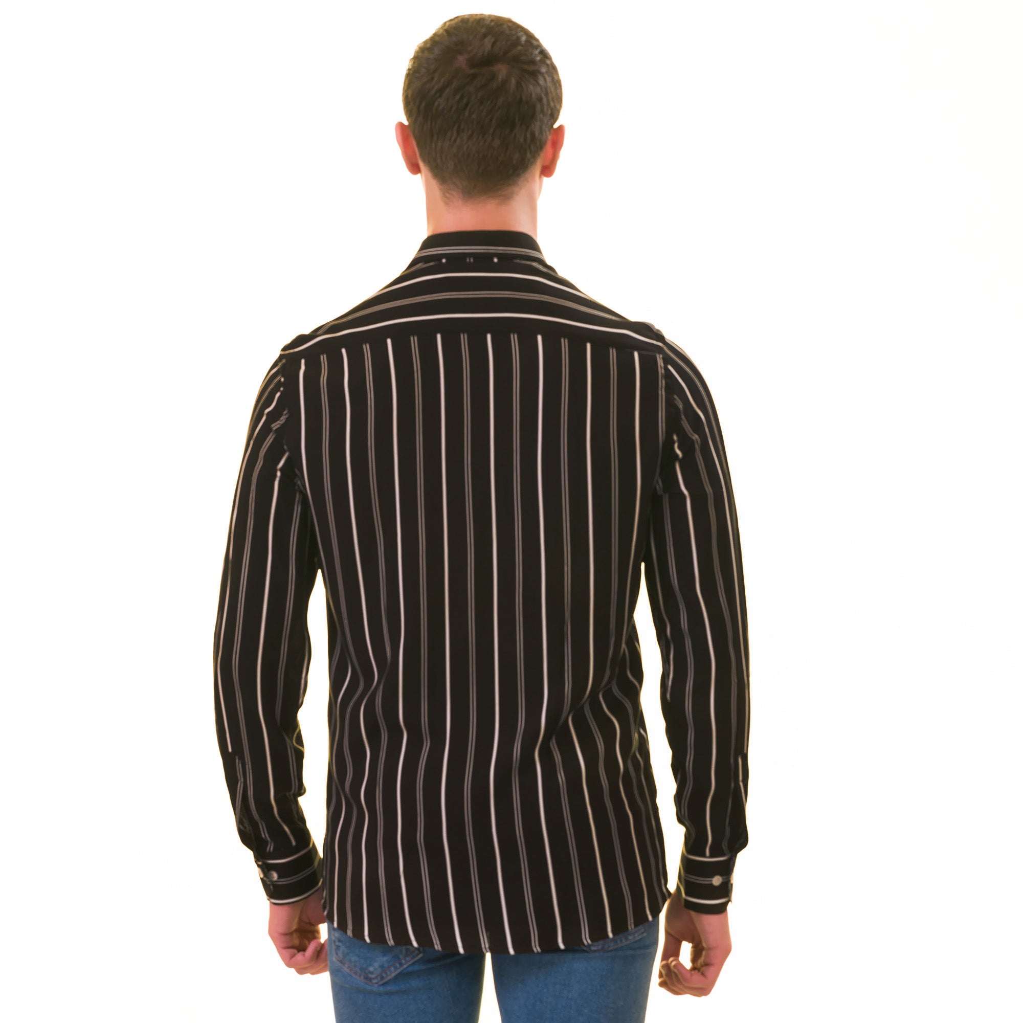 Amedeo Exclusive presents the Mens Black Striped Dress Shirt, perfect for formal or casual wear. This shirt gives you two looks in one with its designer cuff for customizable style.